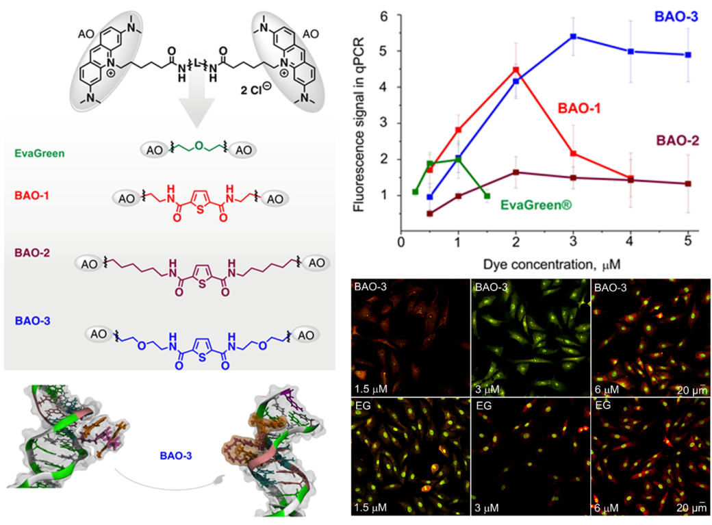 Було розроблено та синтезовано нові барвники на основі біс-акридинового оранжевого (BAO) для виявлення нуклеїнових кислот та ПЛР-аналізу. Проведено порівняльний аналіз барвників BAO та широко використовуваного ДНК-зв'язуючого барвника EvaGreen® для фарбування фібробластів та аналізу за допомогою ПЛР. Барвники BAO перевершили EvaGreen®, дозволяючи проводити ПЛР‑ампліфікацію в ширшому діапазоні концентрацій (0,5-5 мкМ) і створюючи послідовні криві плавлення ДНК, навіть при різних концентраціях ДНК. Моделювання методами молекулярної динаміки показало, що при зв'язуванні з длДНК барвники BAO переходять від стекової до витягнутої конформації, причому цей структурний перехід корелює з підвищенням їхньої флуоресценції. Ці результати поглиблюють наше розуміння взаємодії димерних барвників з длДНК і підтверджують їхній потенціал у застосуванні в ПЛР та біовізуалізації.