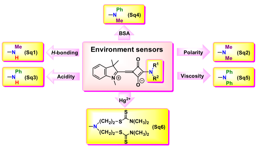 Створено серію гемісквараїнових барвників типу push-pull (Sq1-Sq6) з різними вторинними та третинними аміногрупами. Тип амінозамісника відіграє ключову роль у налаштуванні чутливості барвників до водневого зв'язку, полярності, рН, в'язкості, наявності протеїнів та іонів Hg2+, що робить їх високоадаптивними інструментами для сенсорних застосувань. Селективність, чутливість та інші аналітичні параметри таких хемосенсорів досліджено також у водних розчинах, живих клітинах та тест-системах.