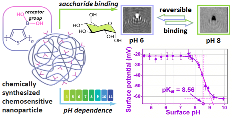 Розроблено масштабований метод синтезу хімічно чутливих наночастинок полі-3-тіенілборонової кислоти, що дозволяє використовувати їх для виявлення вуглеводів та контрольованої доставки ліків. Наночастинки були ретельно охарактеризовані, і було показано, що їх розмір, заряд і поведінка зв'язування сильно залежать від рН і присутності сахариду. Вперше було застосовано новий метод плазмонної мікроскопії (WF-SPRM) для вивчення індивідуальних реакцій наночастинок в режимі реального часу, що дозволило отримати цінну інформацію про їхні хемосенсорні властивості.