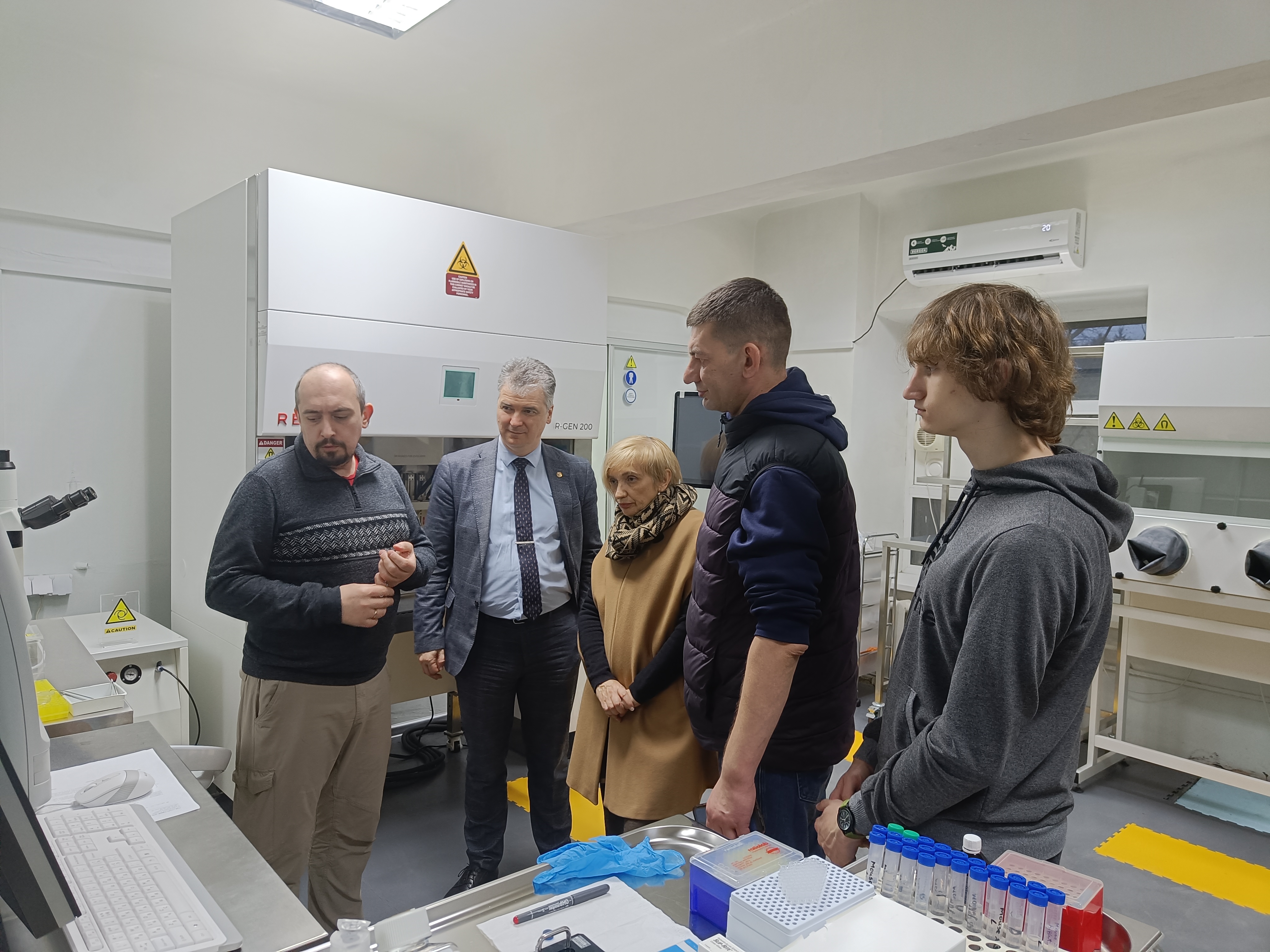 Очільник Координаційної ради Кластеру, перший заступник генерального директора НТК, директор ІХФМ, академік НАН України Валентин Чебанов, заступниця директора ІХФМ Олеся Кулик, професорка Вікторія Ліпсон та кандидат біологічних наук Олексій Солодянкін ознайомилися з роботою нового сучасного освітньо-наукового простору — відділу молекулярно-генетичних досліджень лабораторії біомедичних досліджень Karazin BioMed.