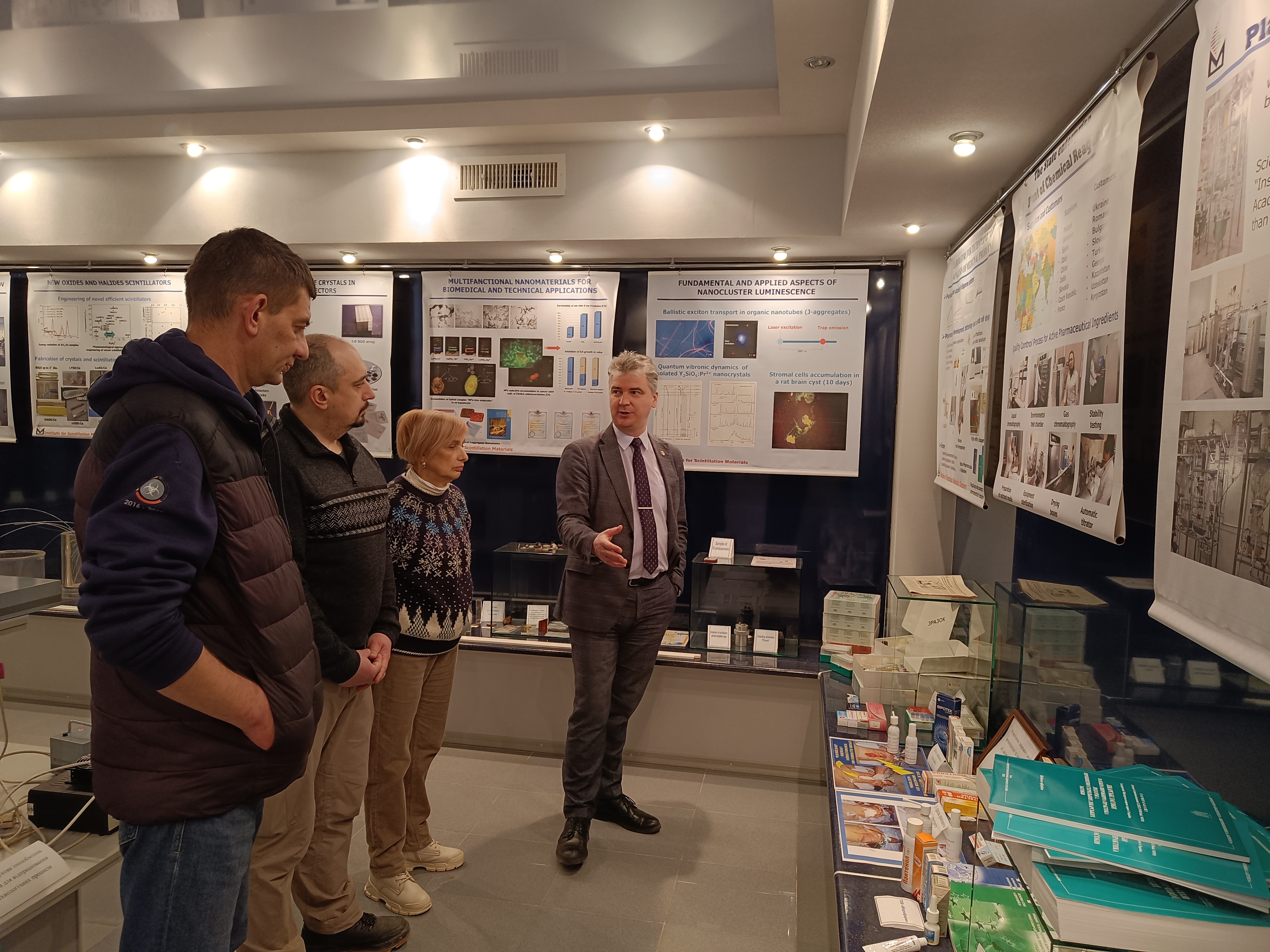 Перший заступник генерального директора НТК, директор ІХФМ, академік НАН України Валентин Чебанов, який очолює Координаційну раду Кластеру, разом із секретарем Ради — заступницею директора ІХФМ, кандидаткою хімічних наук Олесею Кулик ознайомили гостя з виставкою наукових досягнень НТК, новітнім обладнанням і сучасними лабораторіями ІХФМ.