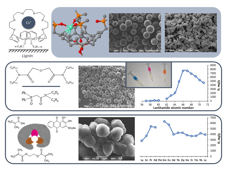 Високоселективні сорбційні матеріали. Селективні сорбційні матеріали є надзвичайно важливими, оскільки вони можуть вилучати та концентрувати цільові речовини зі складних сумішей, роблячи можливими процеси очищення та розділення. Для аналітичного розділення та концентрування важких металів і радіонуклідів було розроблено інноваційні сорбційні матеріали та екстракційні системи з високою селективністю. Сорбенти на основі похідних каліксарену та іон-імпринтованих полімерів забезпечують ефективне вилучення іонів Цезію та рідкісноземельних елементів. Були досліджені каліксарени з різними замісниками на верхньому та нижньому ободах та встановлено вплив цих замісників на їхню здатність зв'язувати іони металів. Іон-імпринтовані сополімери дивінілбензен/ етиленгліколь диметакрилат та метакрилова кислота з різними коефіцієнтами зшивання були синтезовані за допомогою трепінгу або хімічної іммобілізації та досліджено їхні сорбційні властивості. Були створені екстракційні колонки для розділення та концентрування Урану та Америцію з використанням полімерних матеріалів, модифікованих тетраоктилдіамідом дигліколевої кислоти та карбамоїлфосфіновими оксидами.