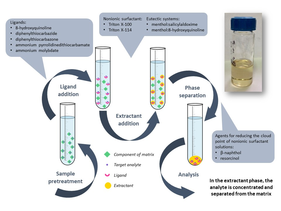 Методи мікроекстракції: мікроекстракція з використанням глибокоевтектичних розчинників та міцелярна мікроекстракція. Глибокоевтектичні розчинники (та, в ширшому розумінні, евтектичні розчинники) наразі застосовуються в різних сферах, зокрема в аналітичній хімії, де вони виступають ефективними екстрагентами органічних та неорганічних сполук. Вони є сумішами речовин, які утворюють евтектику з температурою плавлення нижчою, ніж для окремих компонентів. Основним принципом формування цих систем є здатність їх компонентів до міжмолекулярної взаємодії, такої як водневий зв'язок, завдяки чому вони розглядаються як супрамолекулярні комплекси в рідкому стані. Науковий та технологічний інтерес до (глибоко)евтектичних розчинників пов'язаний з низкою преваг, таких як можливість використання безпечних та біорозкладних речовин, простота приготування, економічна вигідність та потенціал для керування функціональними властивостями. Цей науковий напрямок відділу спрямований на створення та застосування екстракційних систем на основі гідрофобних (глибоко)евтектичних розчинників для підвищення ефективності пробопідготовки до спектрального аналізу. Було отримано ряд нових (глибоко)евтектичних розчинників на основі ментолу, що демонструють різну поведінку тверда-рідка фаза. Дослідження їх екстракційних властивостей підтвердило їх придатність як екстракційних середовищ для вилучення іонів різних металів. Крім того, отримані результати сприяють розробці стратегій для винайдення нових дизайнерських розчинників.